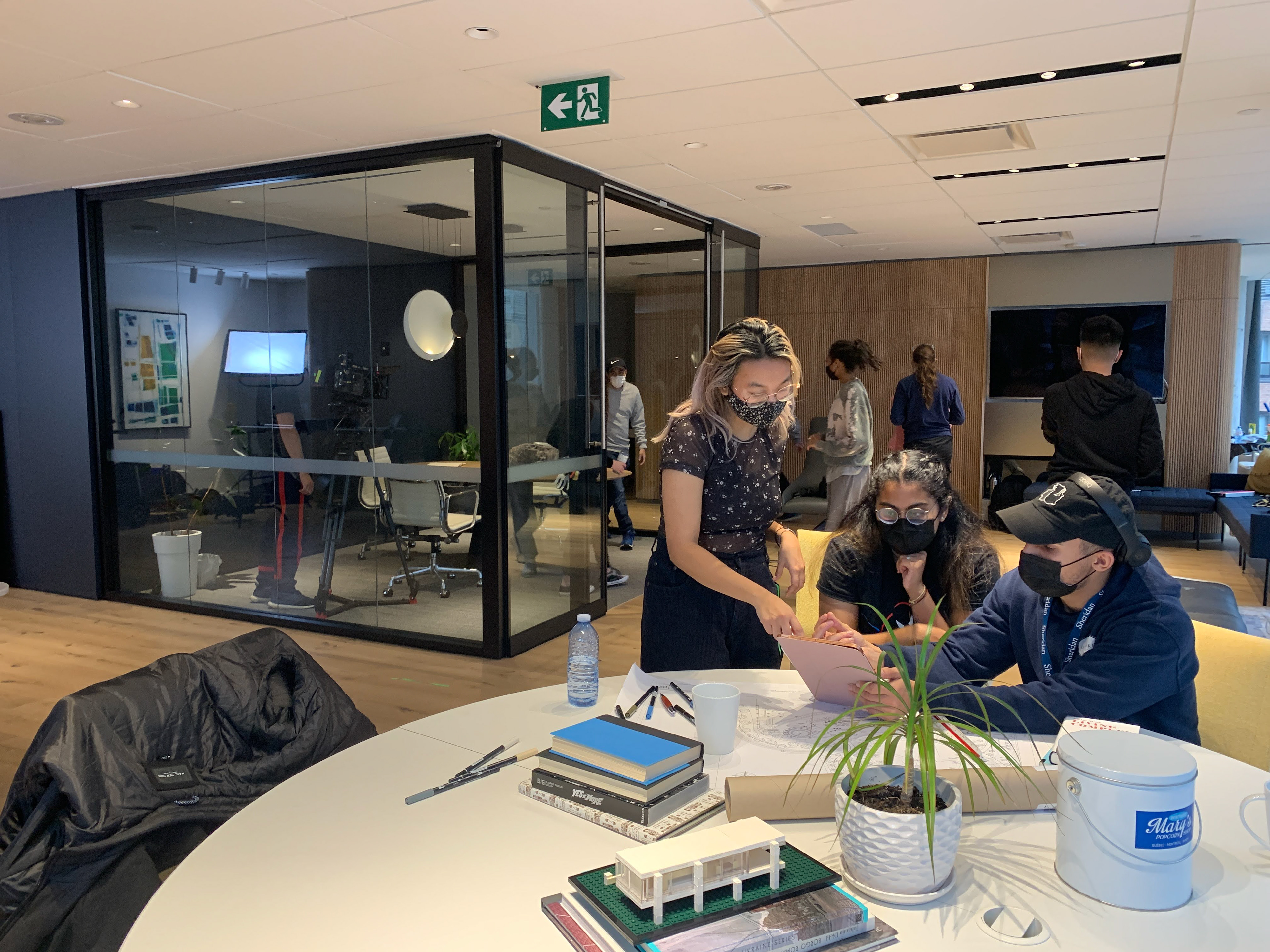 Early concepts for Julian’s office utilised industrial interiors as a way to create an unwelcoming space. Due to budgeting, the office ended up taking a more modern look, with hints of cement and metal. The blue walls correspond to Julian’s palette, and the glass walls trap Bianca. Julian’s apartment is part of a dream sequence, so we wanted to include similarities to Julian’s office. His apartment features blue walls and high-end furniture, along with large floor-to-ceiling windows.