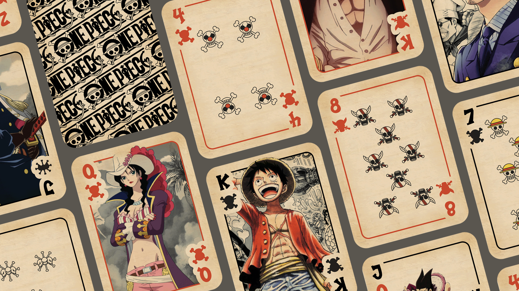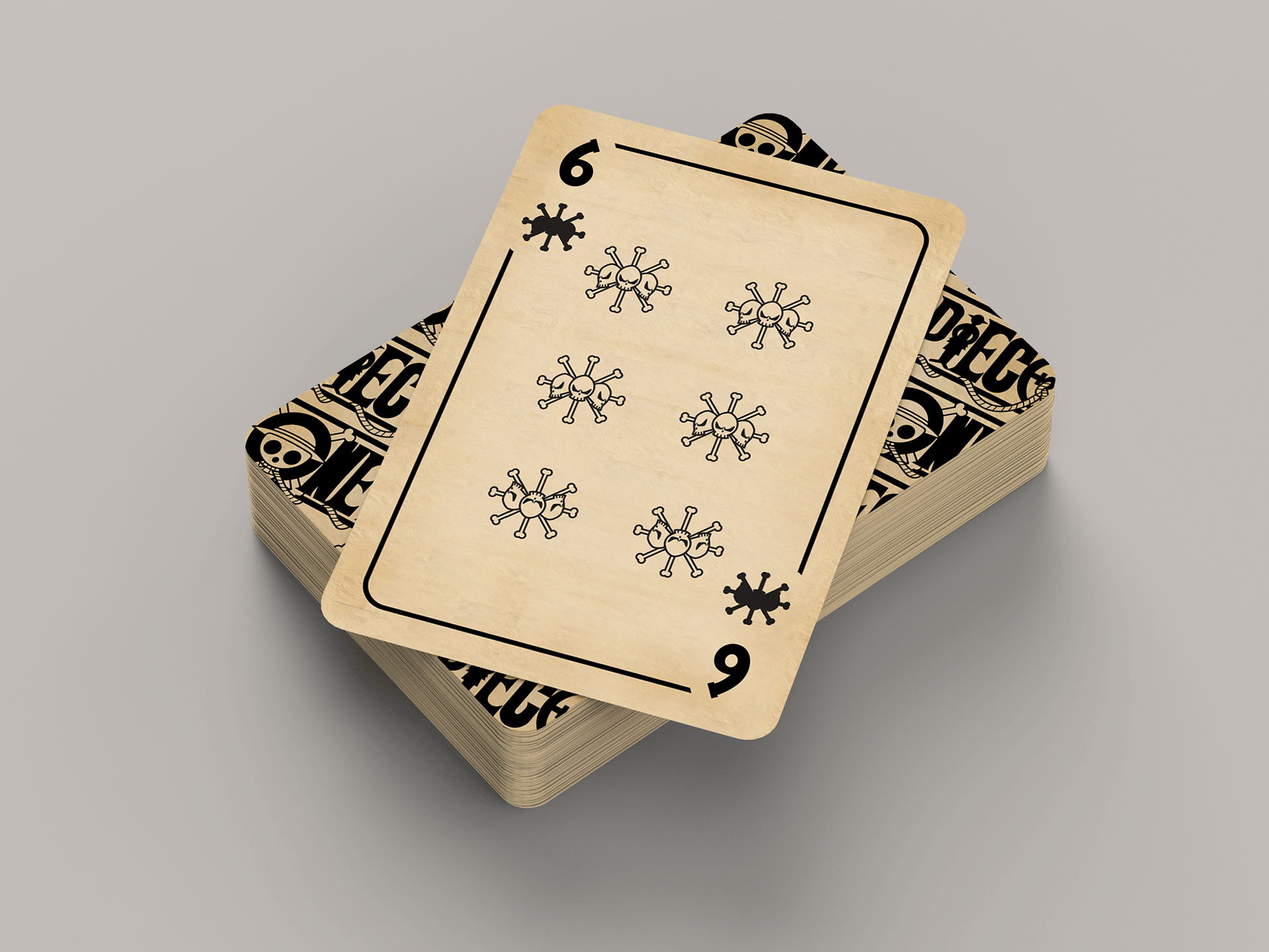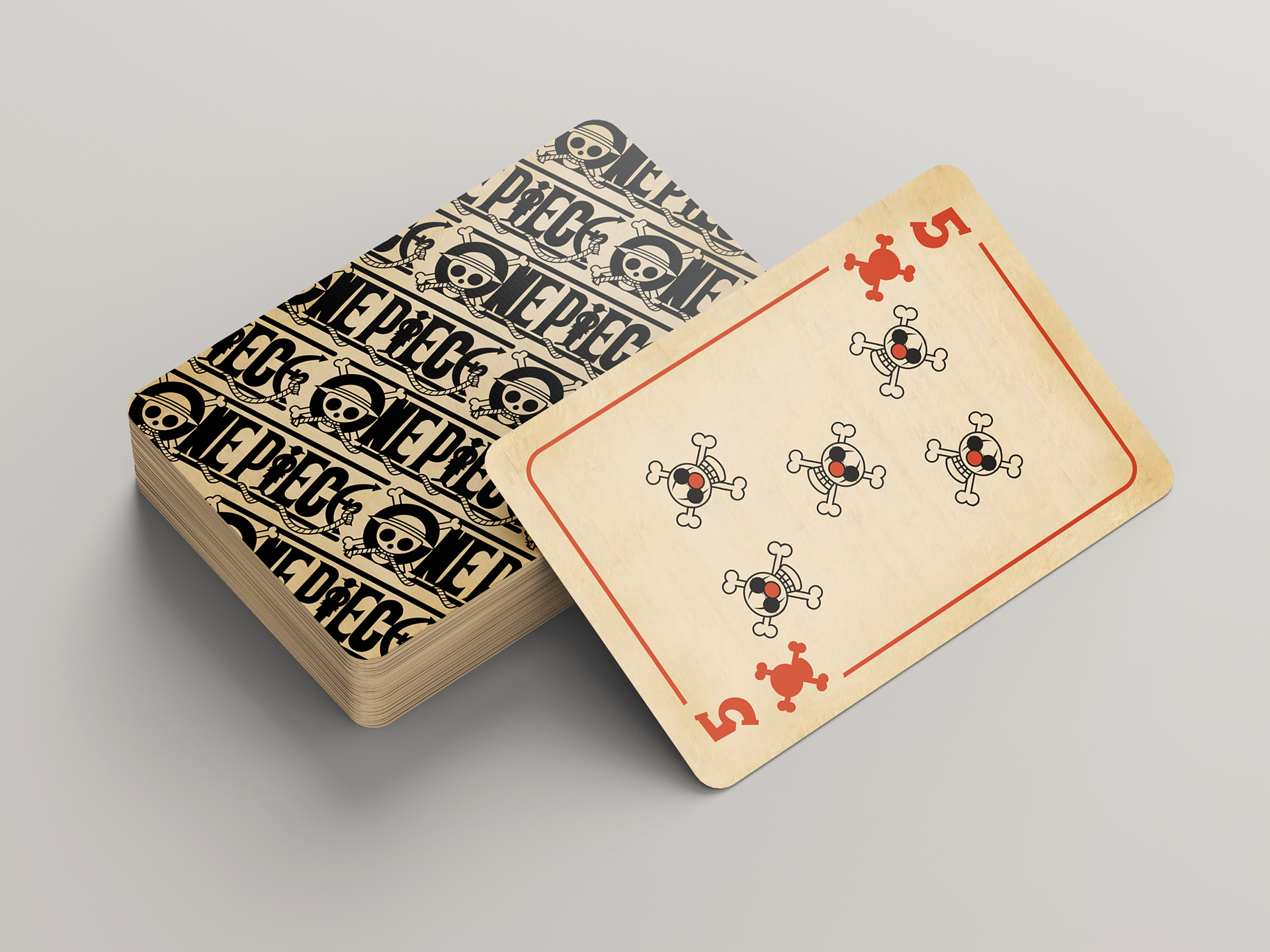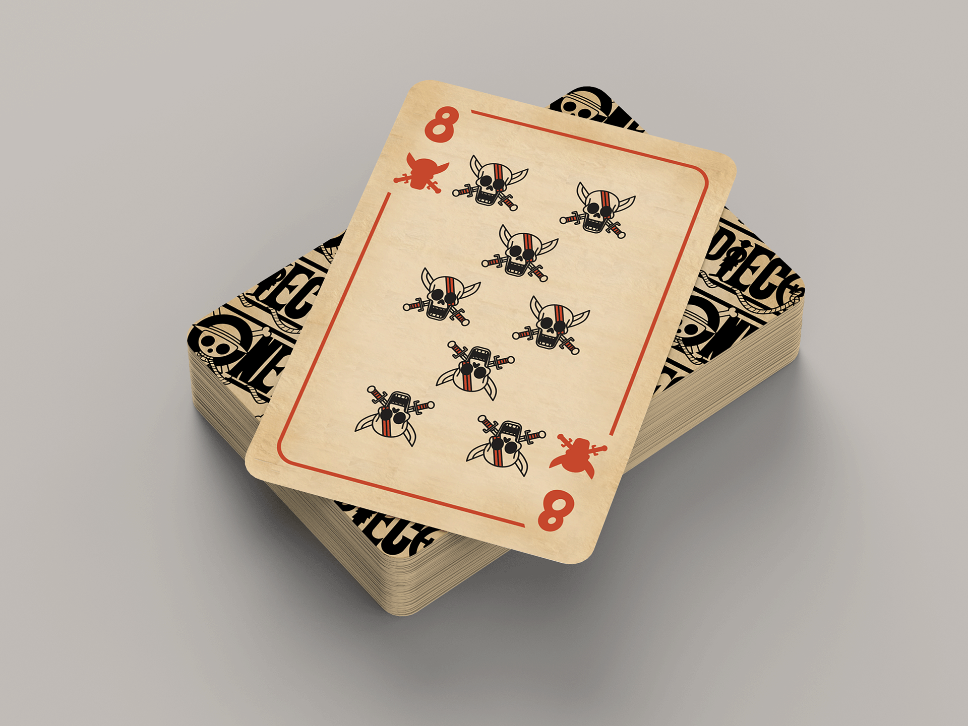 A personal project designed for a friend, these playing cards are based on the anime One Piece. Each suit is based on the four most powerful pirates crews, with the leaders representing the king, queen, and jack cards.